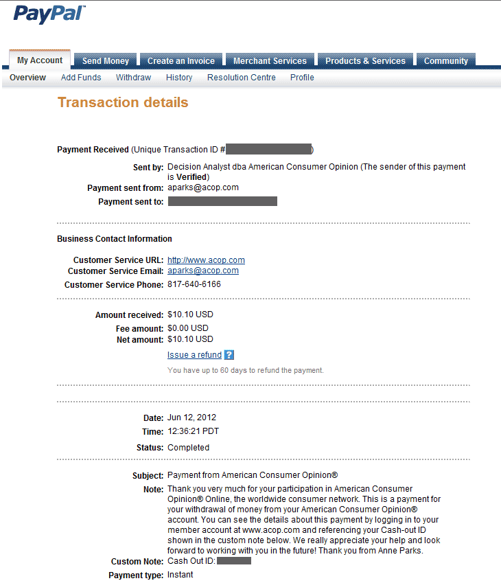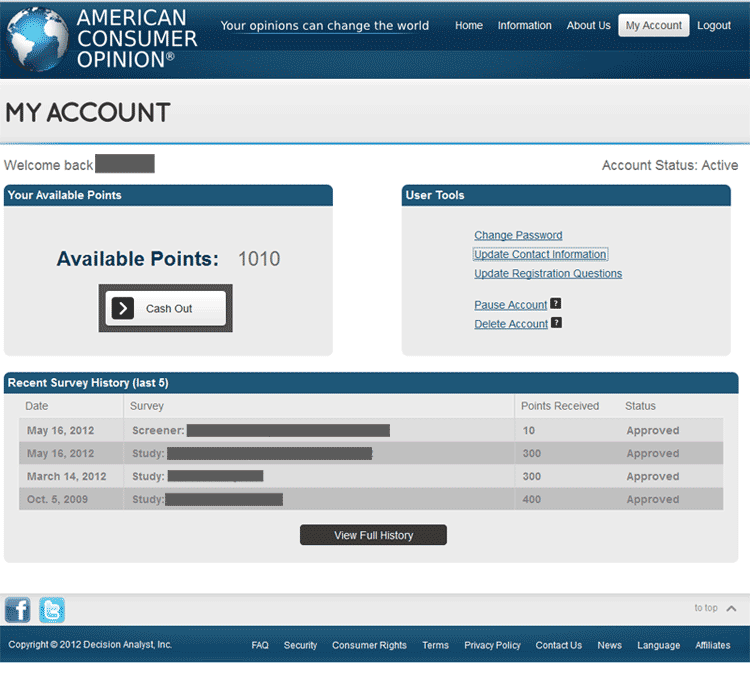 ACOP awards points for the completion of surveys as well as screeners. With only 1,000 points in your account (worth $10 US, or ~£6) you may redeem your points for cash. You may leave your points in your account indefinitely – you can cash out at the bare minimum level, or wait until you have a sizable sum if you’d prefer to receive larger payments.
